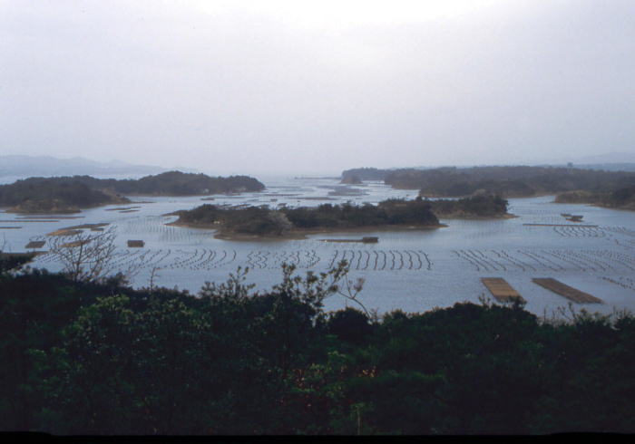 核入れを施した母貝を、イカダから吊して海に沈めます。